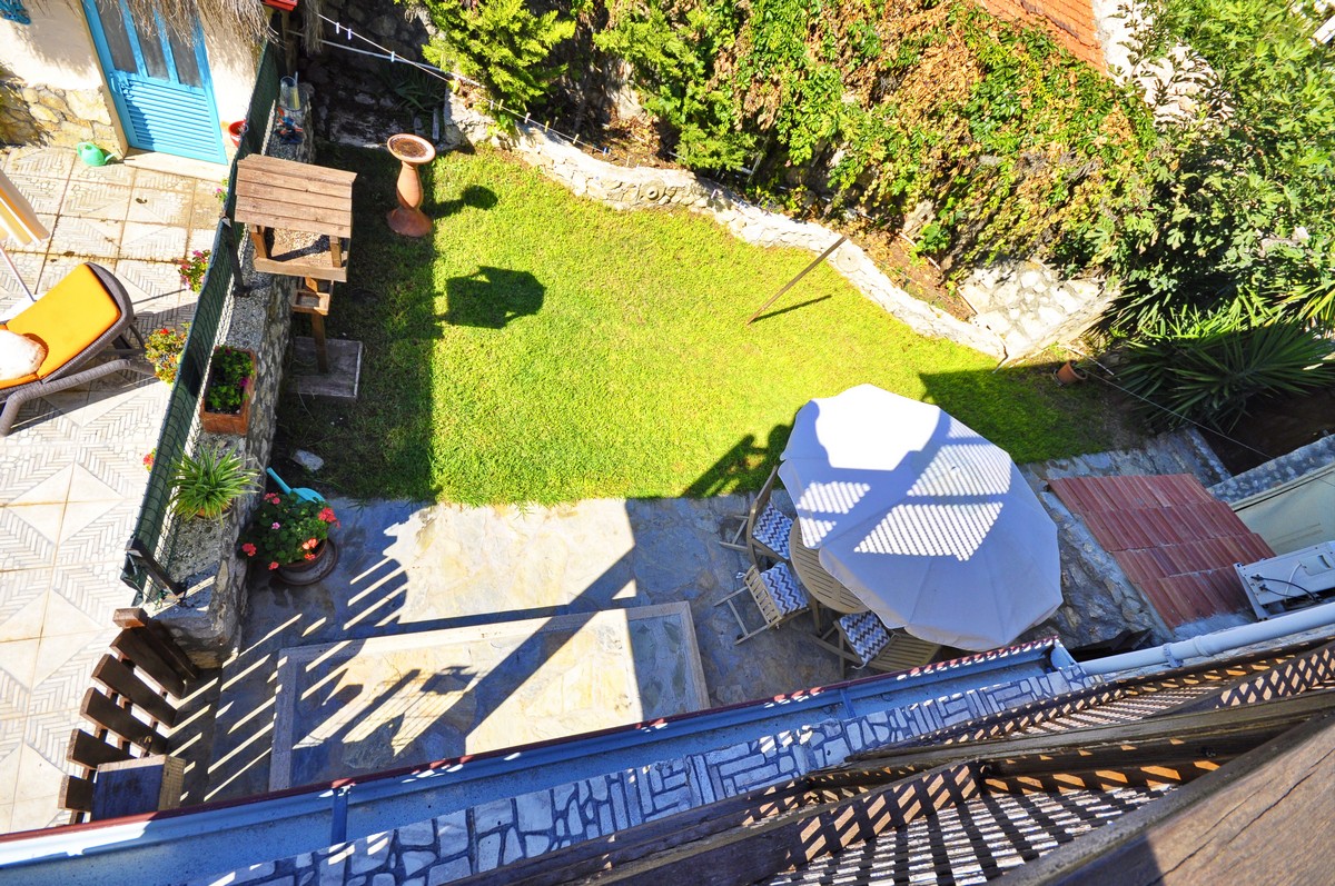 Upstairs, an open wooden staircase leads to a landing that could serve as a home office, a second lounge, and an additional double bedroom. A private upper terrace offers breathtaking views over Kayakoy’s valley and its iconic historical ruins. The upper floor also includes a bathroom with a bathtub and ample storage space.