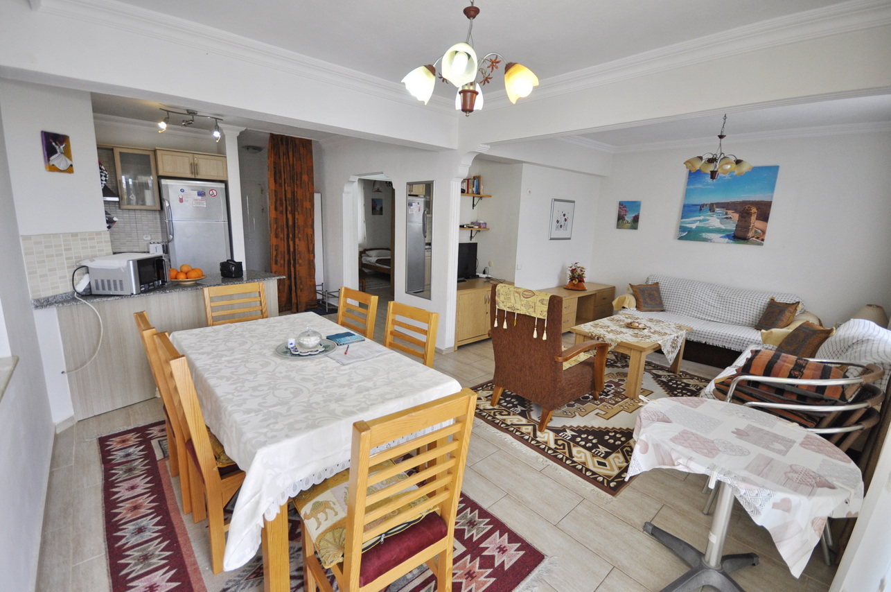 This charming duplex apartment is located in a well-maintained complex just 300 meters from the famous Calis Beach. The complex consists of two blocks, a large communal swimming pool, a children’s pool, and beautifully landscaped gardens. Each block has seven apartments, and this particular unit spans the first floor and attic floor, offering stunning sea views and spacious living areas.