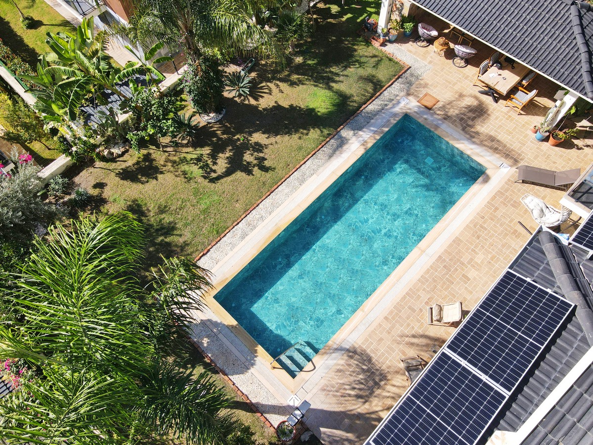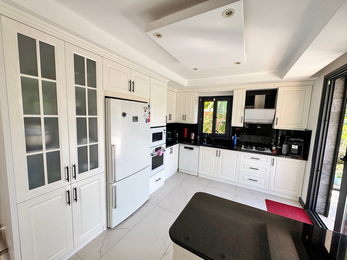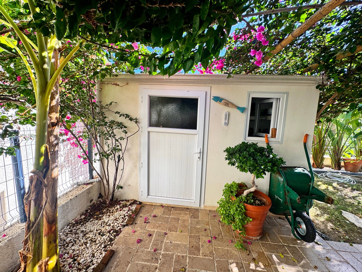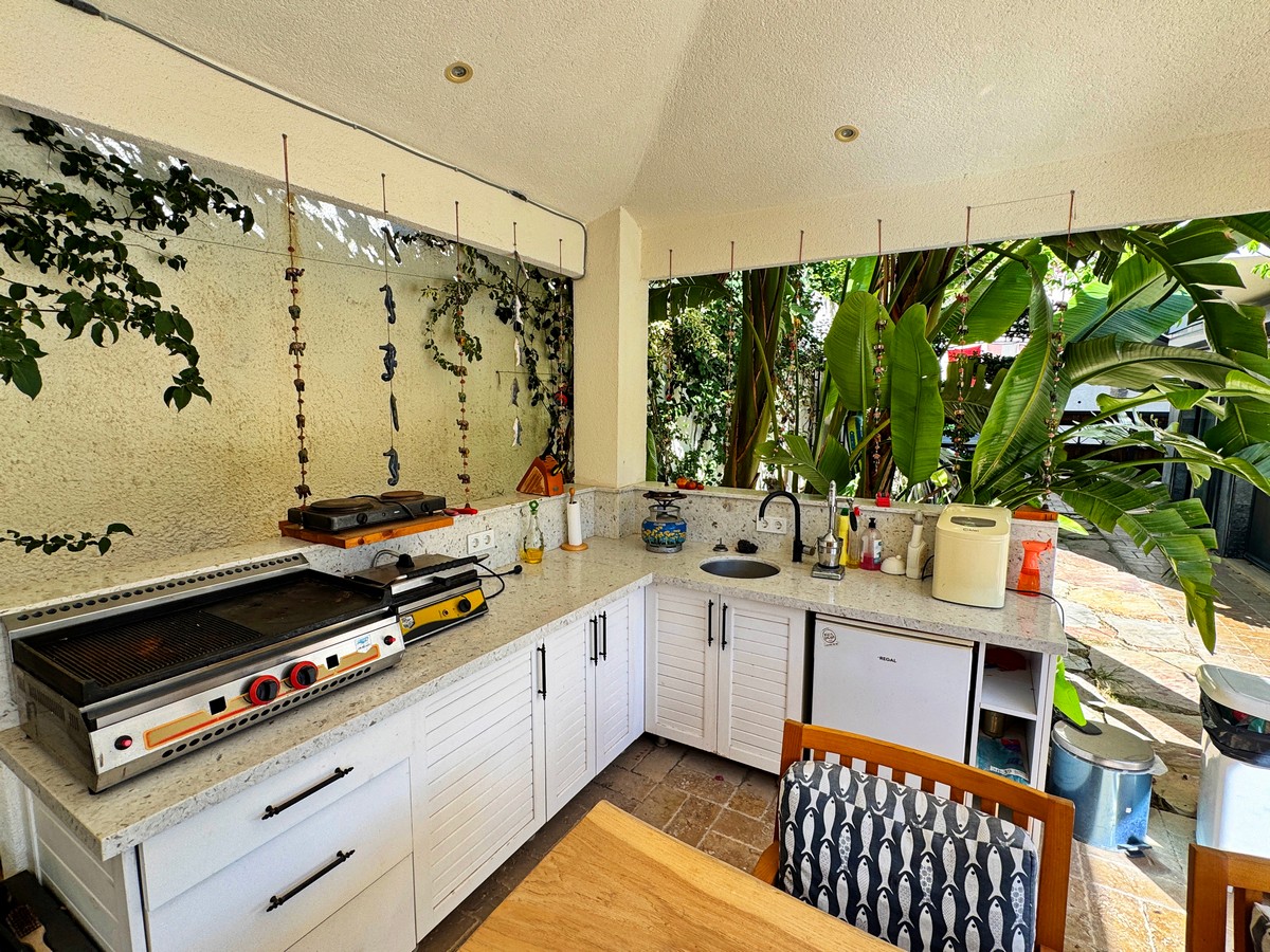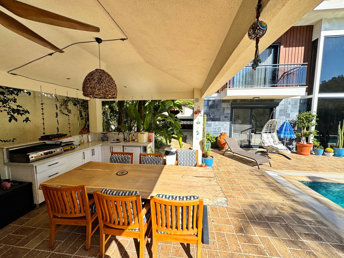 The beautifully landscaped garden invites you to relax by the private swimming pool, enjoy the sunbathing terrace, host friends around the stone BBQ, or dine outdoors in the kitchen-equipped alfresco area. A storage room and private parking add convenience.