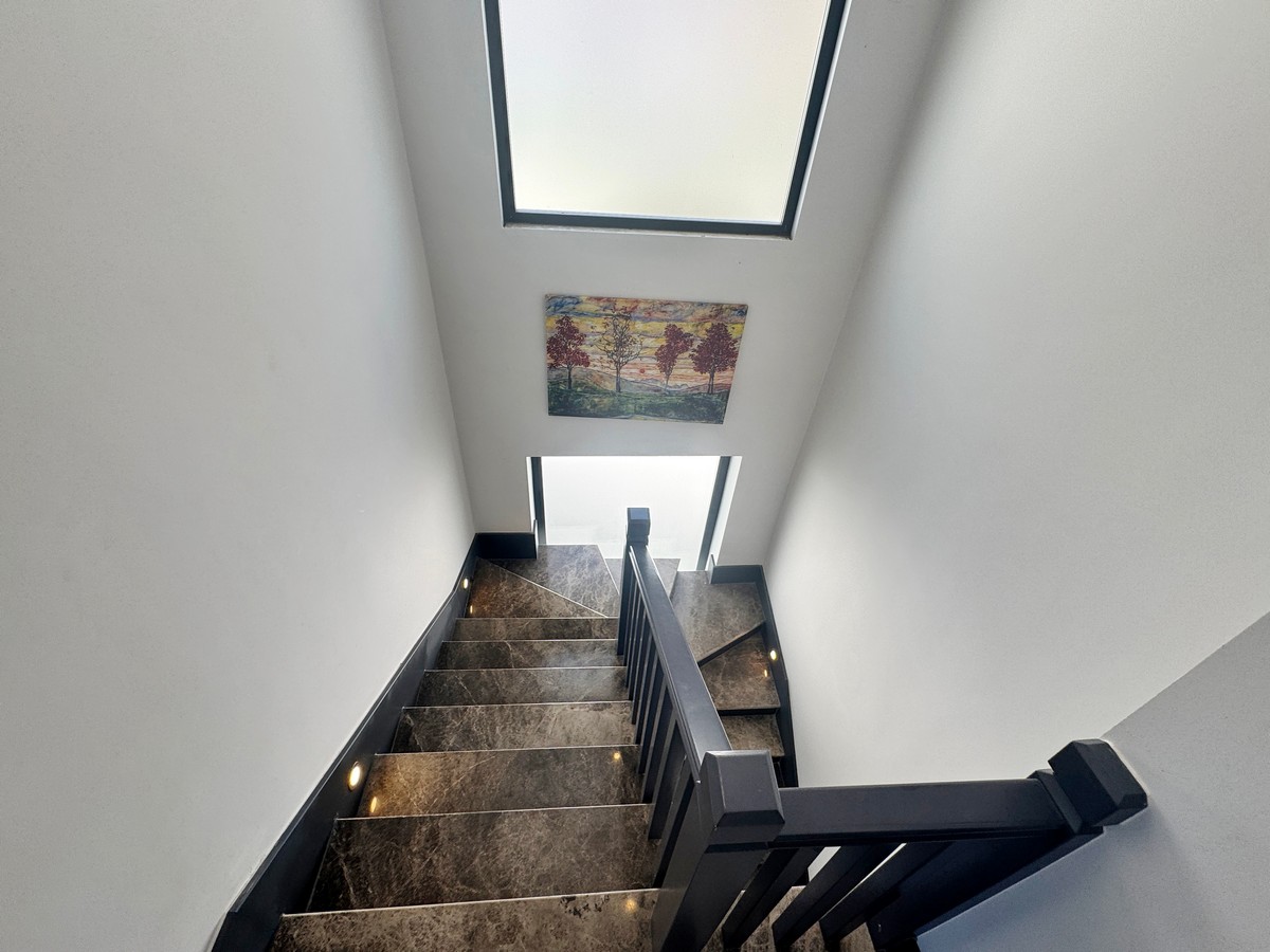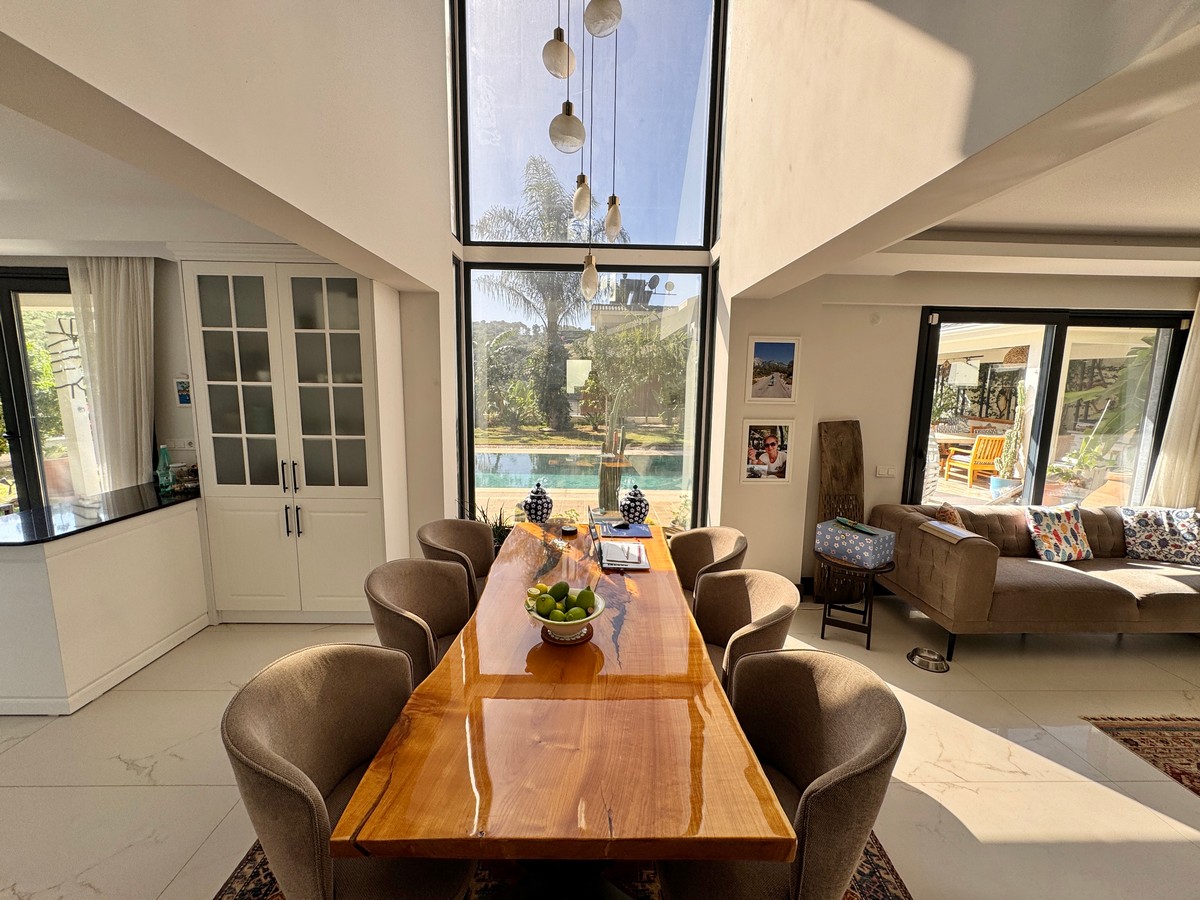 The ground floor features a spacious living room with a high atrium ceiling and floor-to-ceiling windows that fill the space with natural light. A modern, fully fitted kitchen, stylish dining area, and seamless access to the pool terrace and garden make this level ideal for both daily living and entertaining. A guest WC completes this floor.