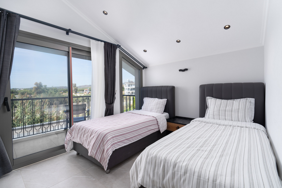 First floor: Two en-suite bedrooms sharing a balcony with pool views.