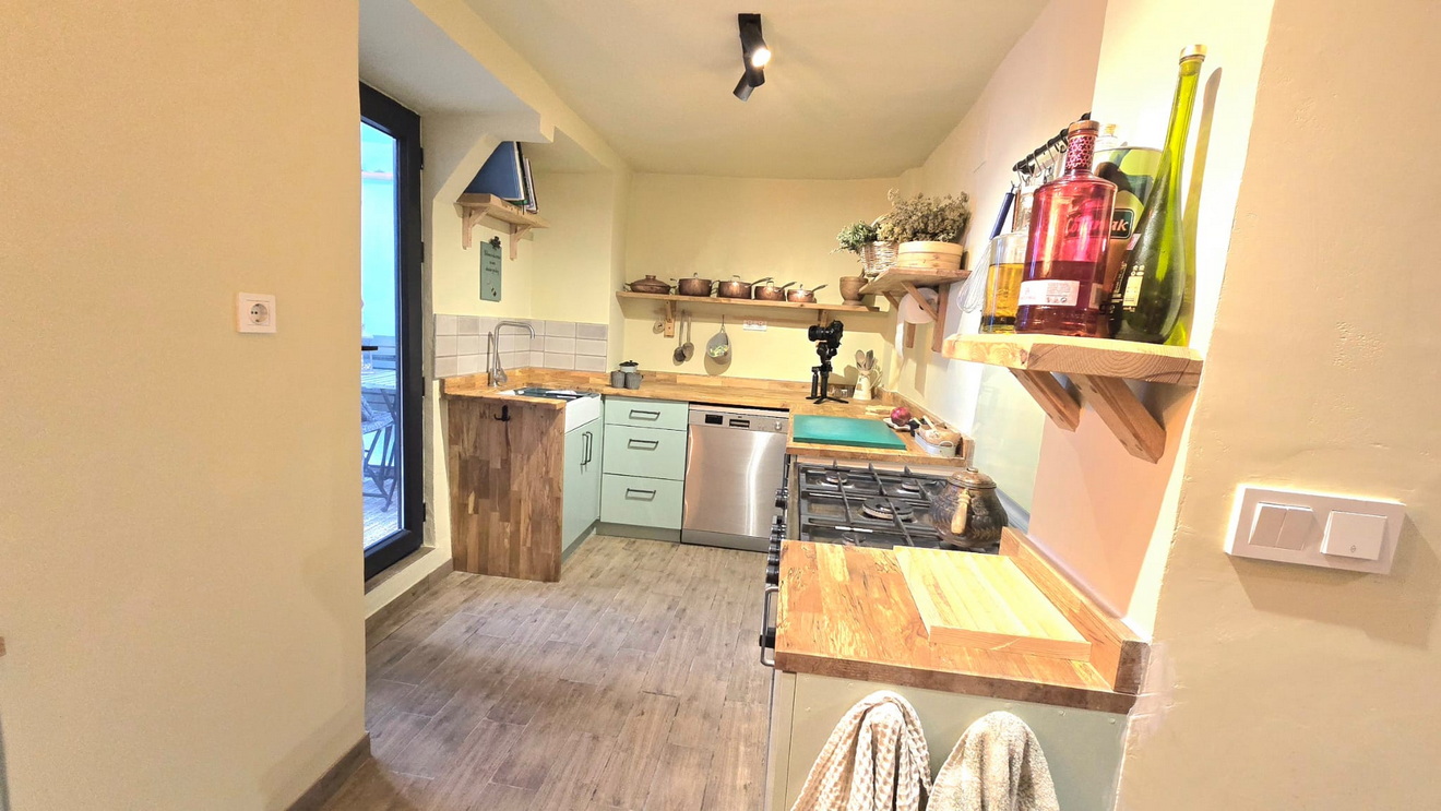 Ground Floor : Separate kitchen , living room with cast iron stove , shared family bathroom , garden.