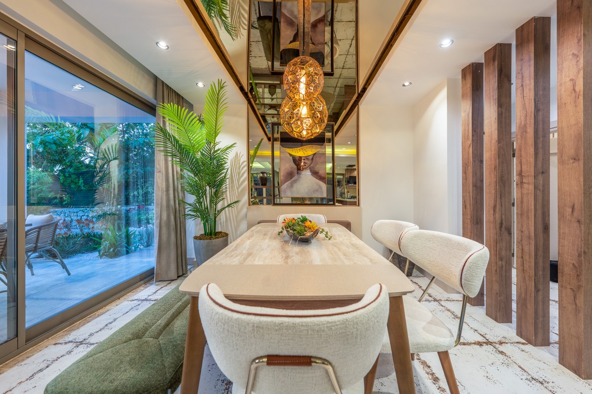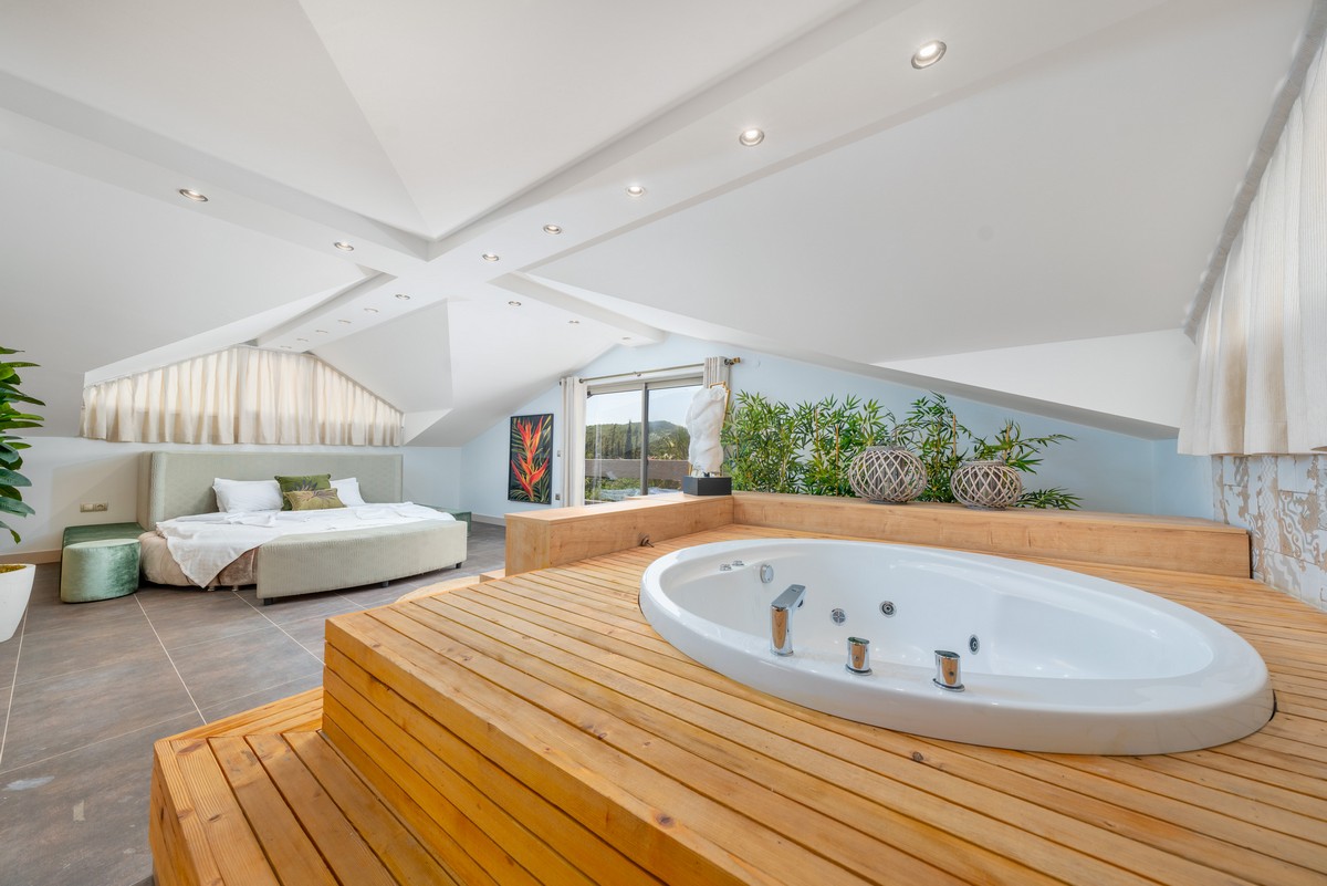 This villa built over 3 floors, with the whole of the ground floor hosting a modern open planned kitchen with dining area and very spacious lounge with large Terrace and WC.Also the villa has a indoor pool and sauna .