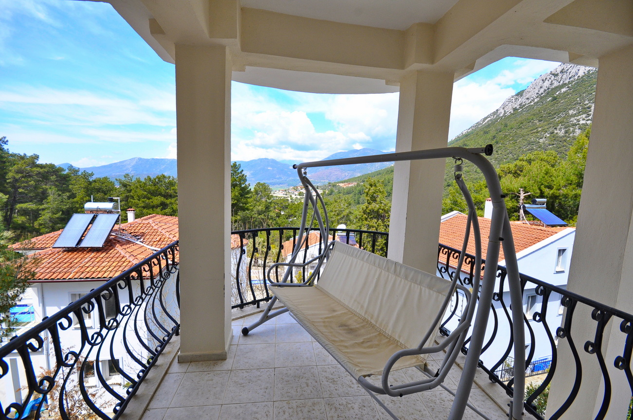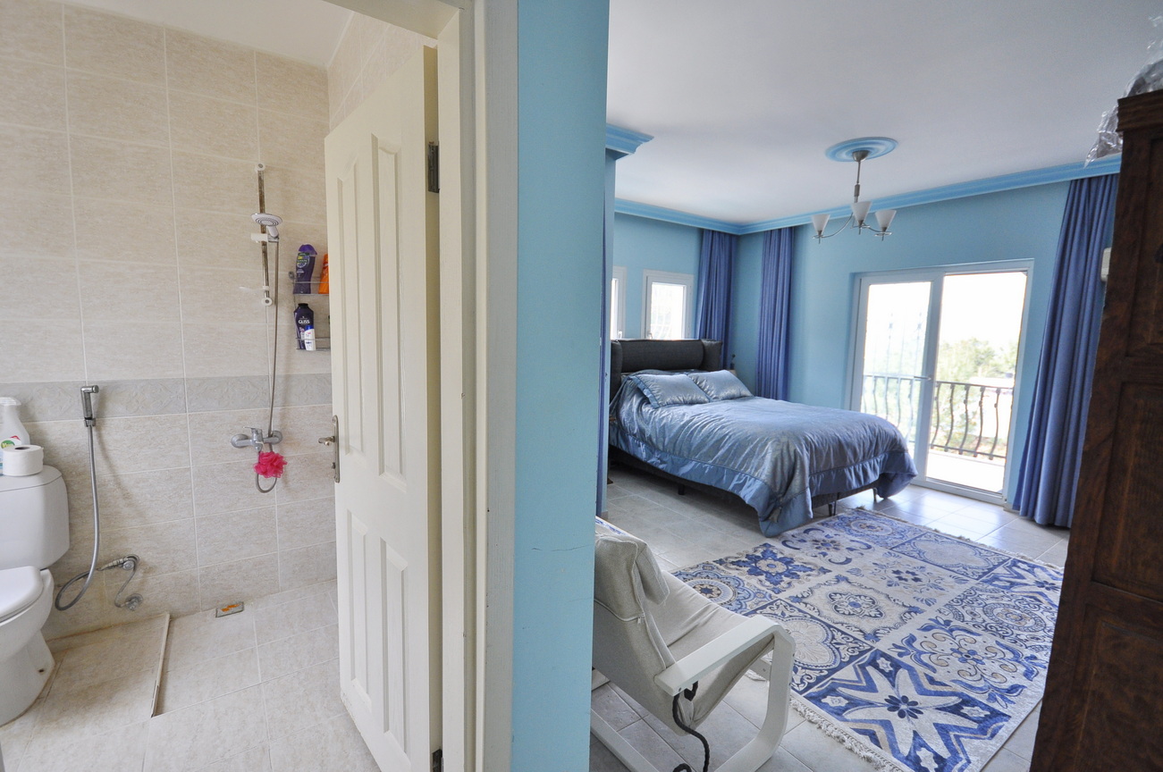 First Floor: The landing is wide and leads on to two main en-suite bedrooms.The first bedroom has a decent size entrance with a large bathroom on the right. The bathroom is fully tiled with attractive decorative ceramic tiling and has a wide wash basin and basin and wall cabinet. The main bedroom is light and airy with 4 windows and a double patio door that leads to a large terrace that overlooks the forest and mountains.