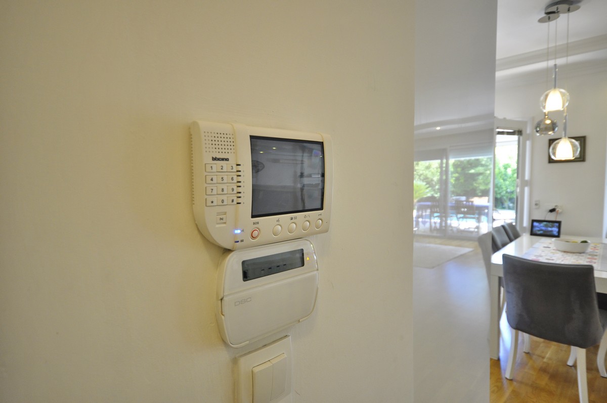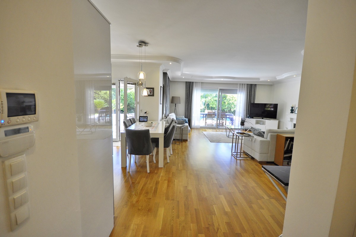 На первом этаже находится просторный холл со встроенными шкафами и гостевым санузлом, открытая планировка гостиной, современной кухни и столовой, камин и большие панорамные двери, ведущие на террасу и к бассейну. Также есть спальня, которая используется как кабинет или комната отдыха.