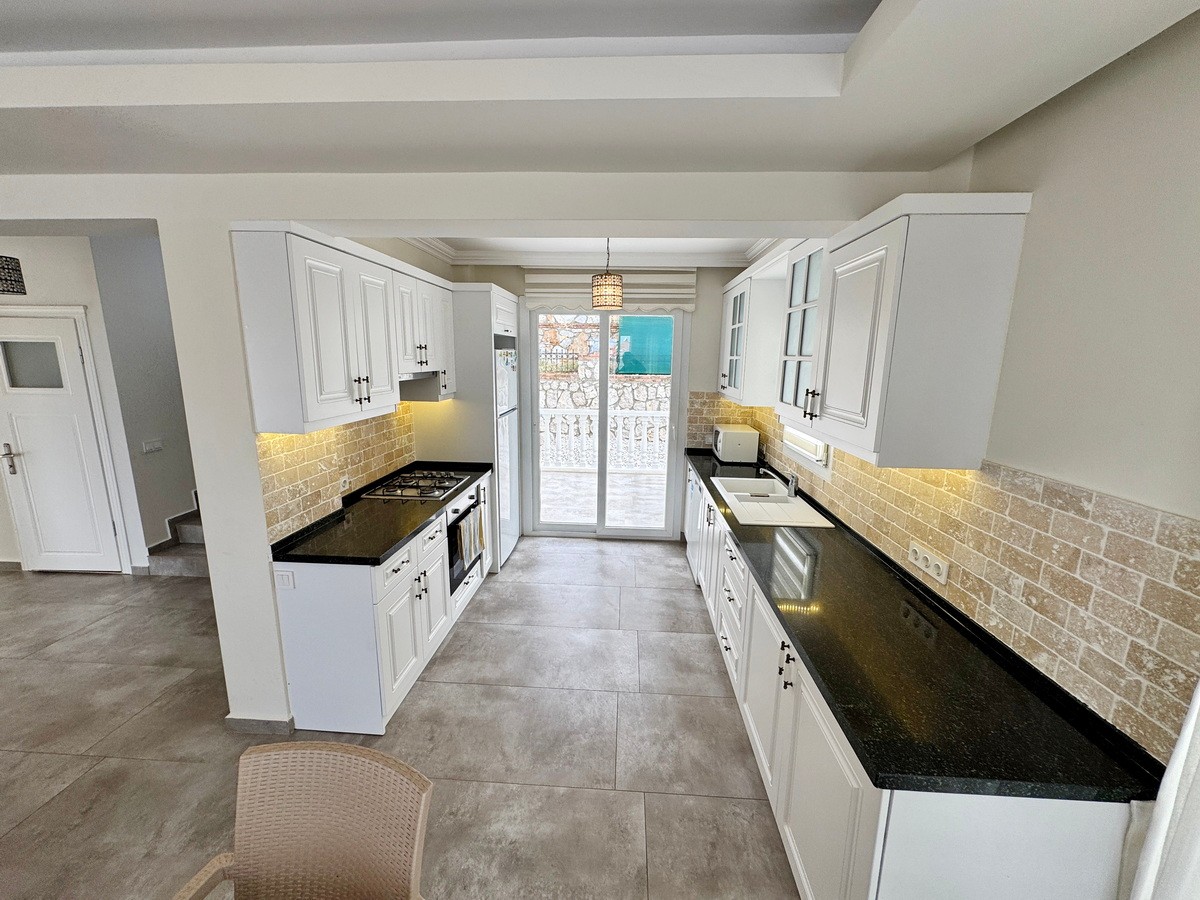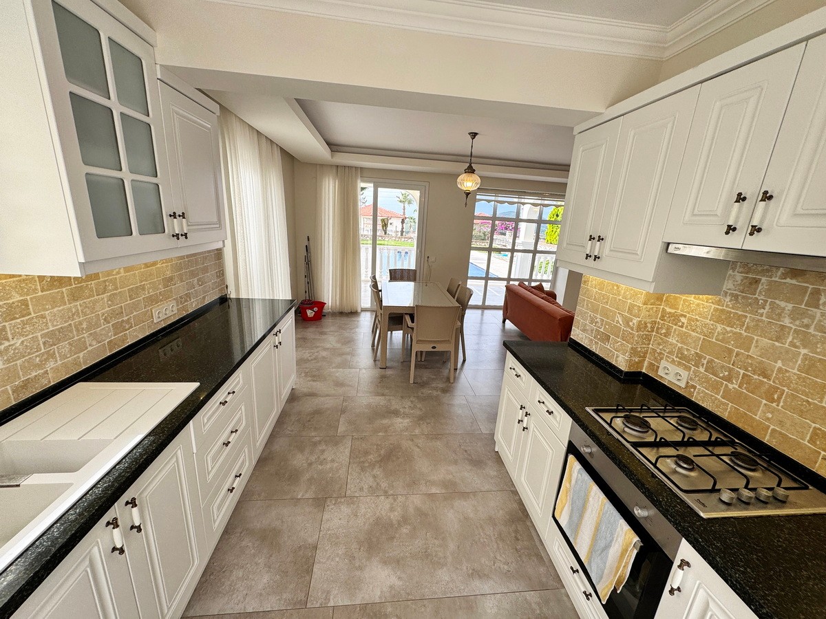 Tam donanımlı modern mutfak, granit tezgâhlar ve bol dolap alanı ile fonksiyonelliği estetikle buluşturur. Arka terasa açılan mutfak, ferah yemek alanına ve aydınlık salona doğru akıcı bir planla uzanır.