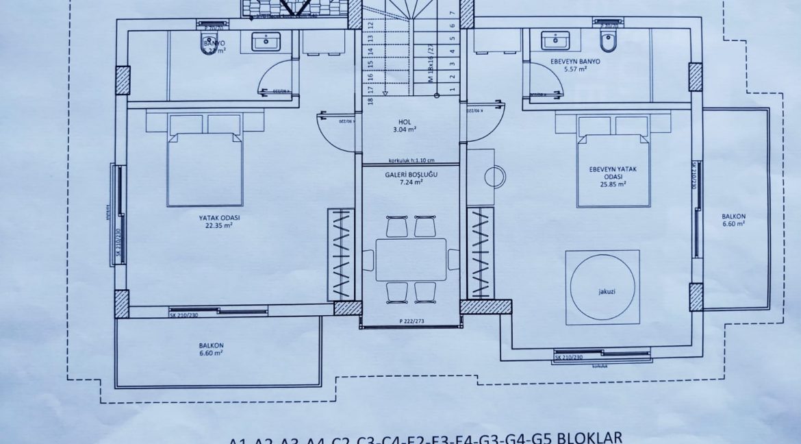 1. Kat: Jakuzili ebeveyn yatak odası + ebeveyn banyosu, ikinci yatak odası da en-suite banyoludur. Her iki odanın da özel balkonu vardır.
