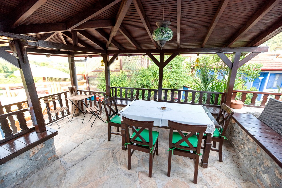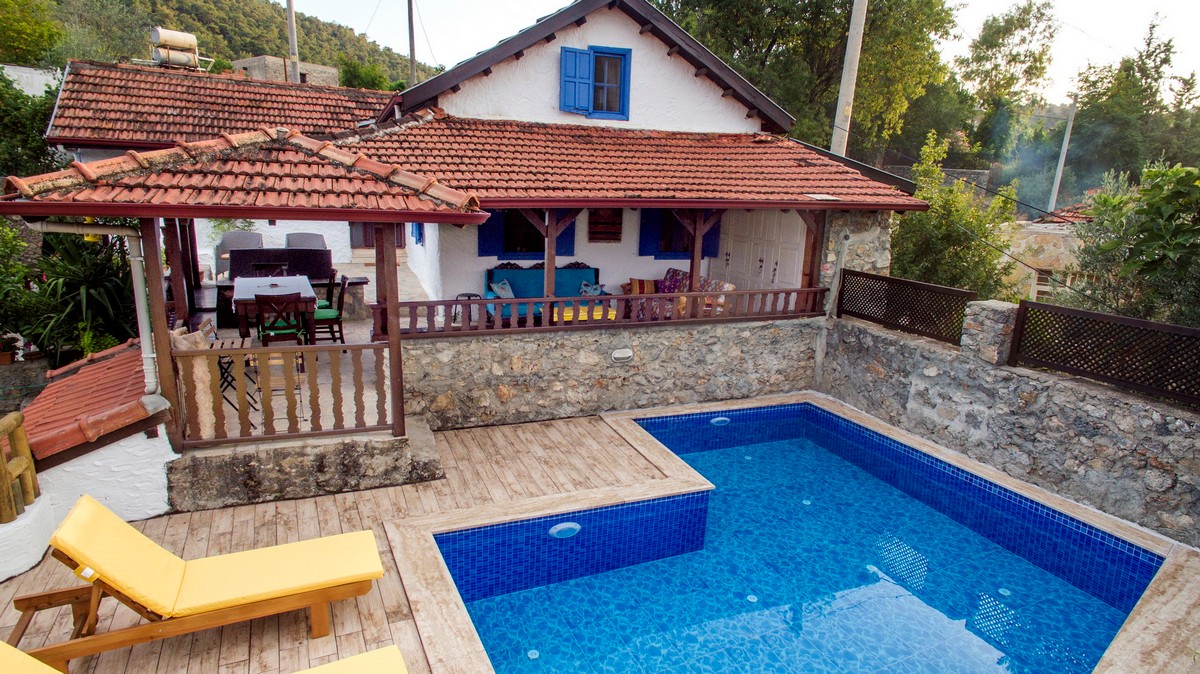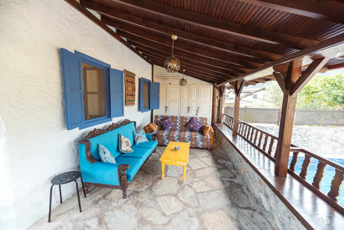 Ana mülkün önünde havuza ve olgun bahçeye bakan geniş, gölgeli bir teras yer alır.